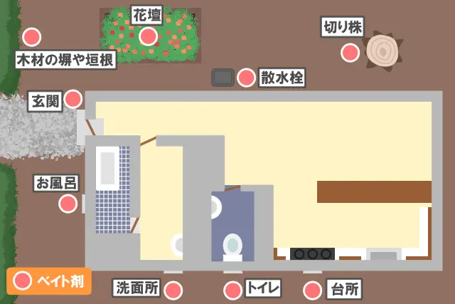 ベイト剤をセットする場所ですが、庭木の周りや花壇。浴室・洗面所など水回りは、比較的シロアリが住みつきやすい場所なので、必ずしかけておきましょう。